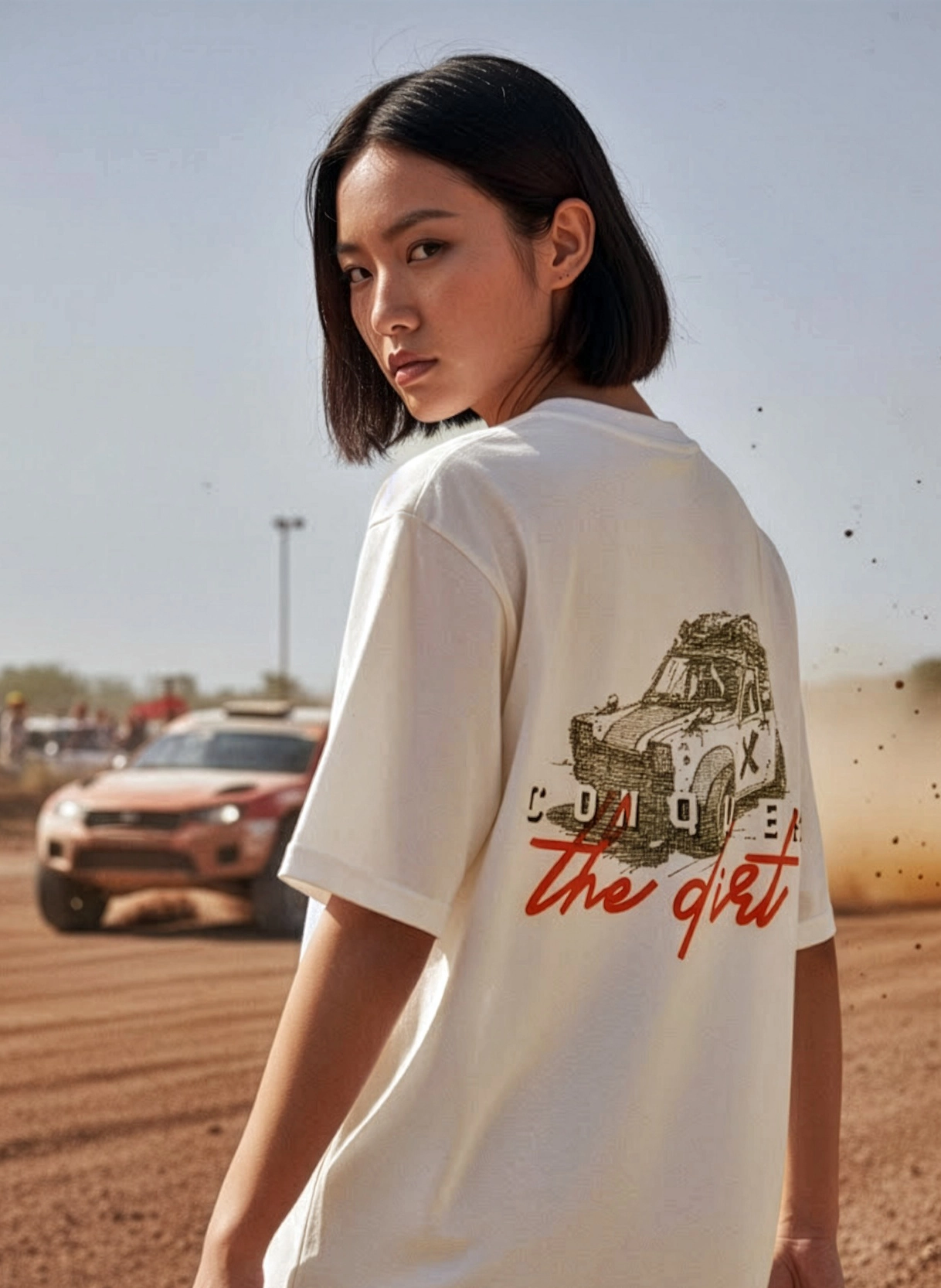 Kick up the dust and own every road with Oriko’s “Dirt Mode” Oversized Graphic Tee. Featuring a rally car bursting through the dirt with the words “Conquer the Dirt”, this tee embodies motion, energy, and street-racer grit.