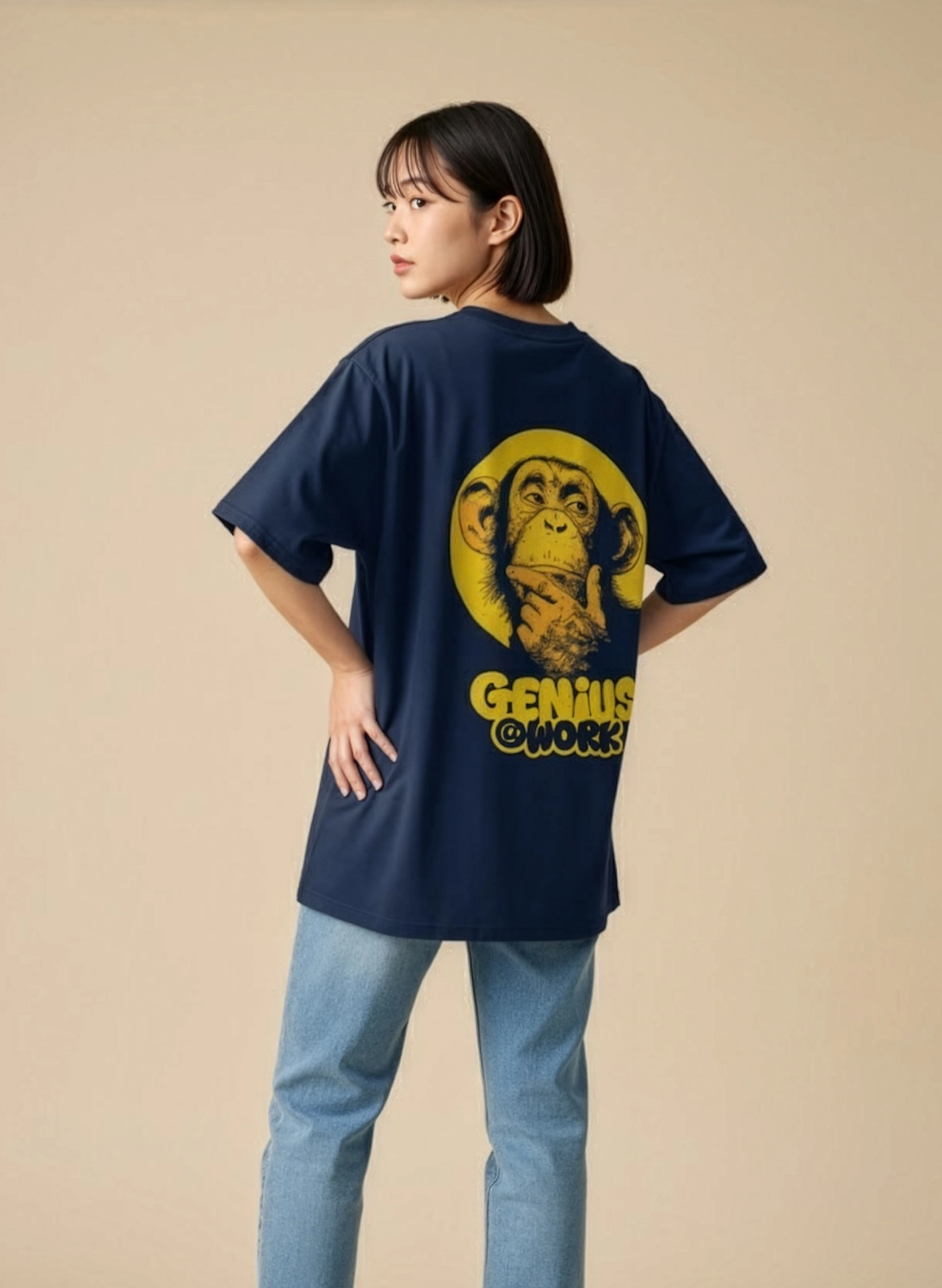 Smart looks meet street smarts. The Oriko “Genius at Work” Oversized Graphic Tee features a bold thinking chimp illustration — a tribute to deep thinkers, creatives, and rule breakers who wear intelligence like art.