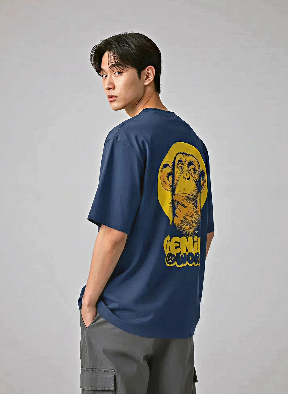 Smart looks meet street smarts. The Oriko “Genius at Work” Oversized Graphic Tee features a bold thinking chimp illustration — a tribute to deep thinkers, creatives, and rule breakers who wear intelligence like art.